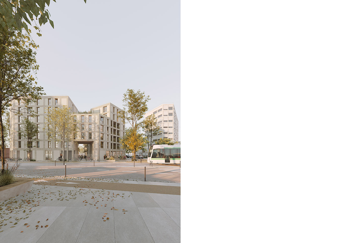Le lot 04 se situe au cœur des enjeux d’une phase d’urbanisation et de renaturation du site : de par son implantation, le projet crée une jonction entre le bâti existant et le bâti projeté, tout en créant une protection face aux contraintes du carrefour des 6 routes.