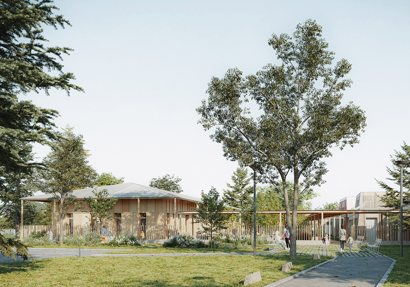 L’extension accueillera le réfectoire pour les maternelles et les primaires ainsi que la cuisine. Elle sera reliée au bâti existant par un auvent. La nouvelle structure sera en bois, un matériau choisi pour sa robustesse et son faible impact environnemental. L’écriture de la façade contraste avec la massivité du béton de l’équipement existant.